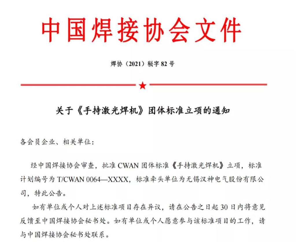 ·《手持激光焊機》團體標準立項-標準牽頭公司為無錫漢神電氣