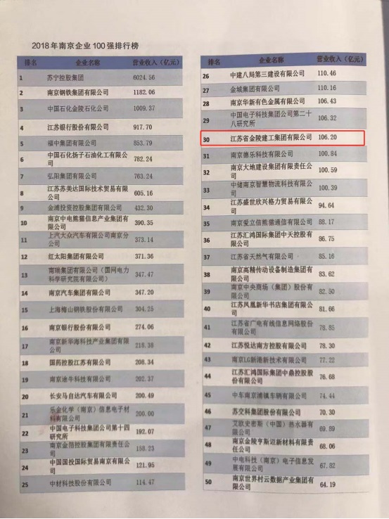 •  2019年12月20日,南京市企業(yè)聯(lián)合會、南京市企業(yè)家協(xié)會公布“2018年南京市企業(yè)100強(qiáng)”榜單,集團(tuán)公司入選榜單,位居第30名。